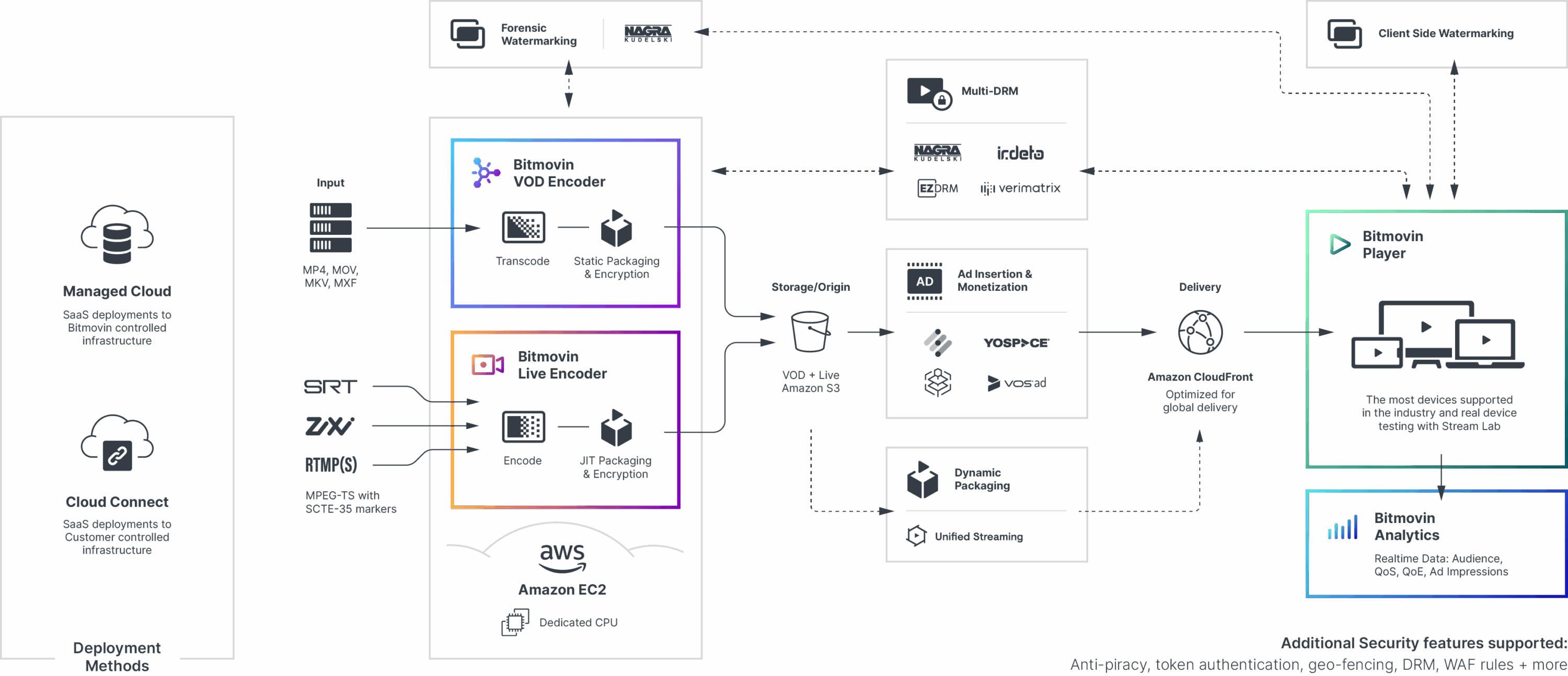 Bitmovin and AWS provide a secure and compliant foundation for global video delivery. From multi-DRM support to server-side and client-side forensic watermarking, your content remains protected at every stage of the streaming workflow.
